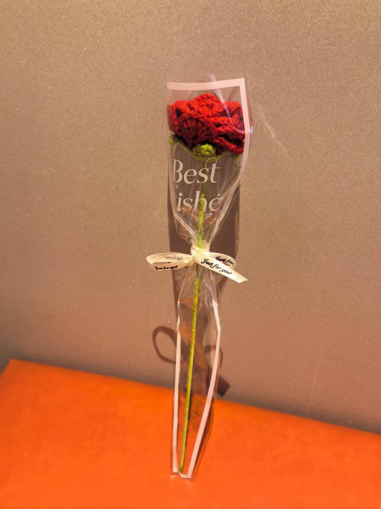 A crocheted red rose, size: 30cm long branch. It is a great gift.