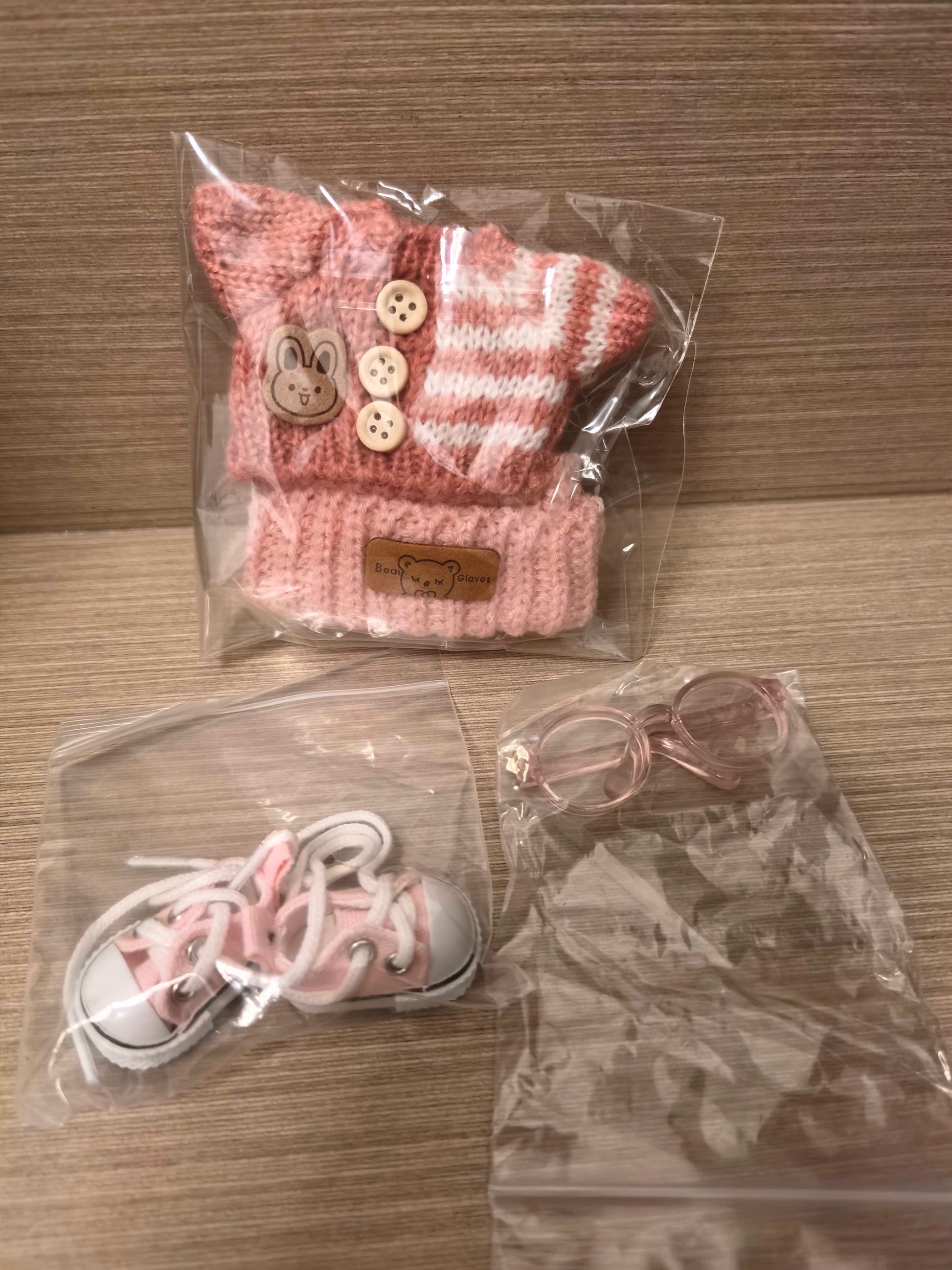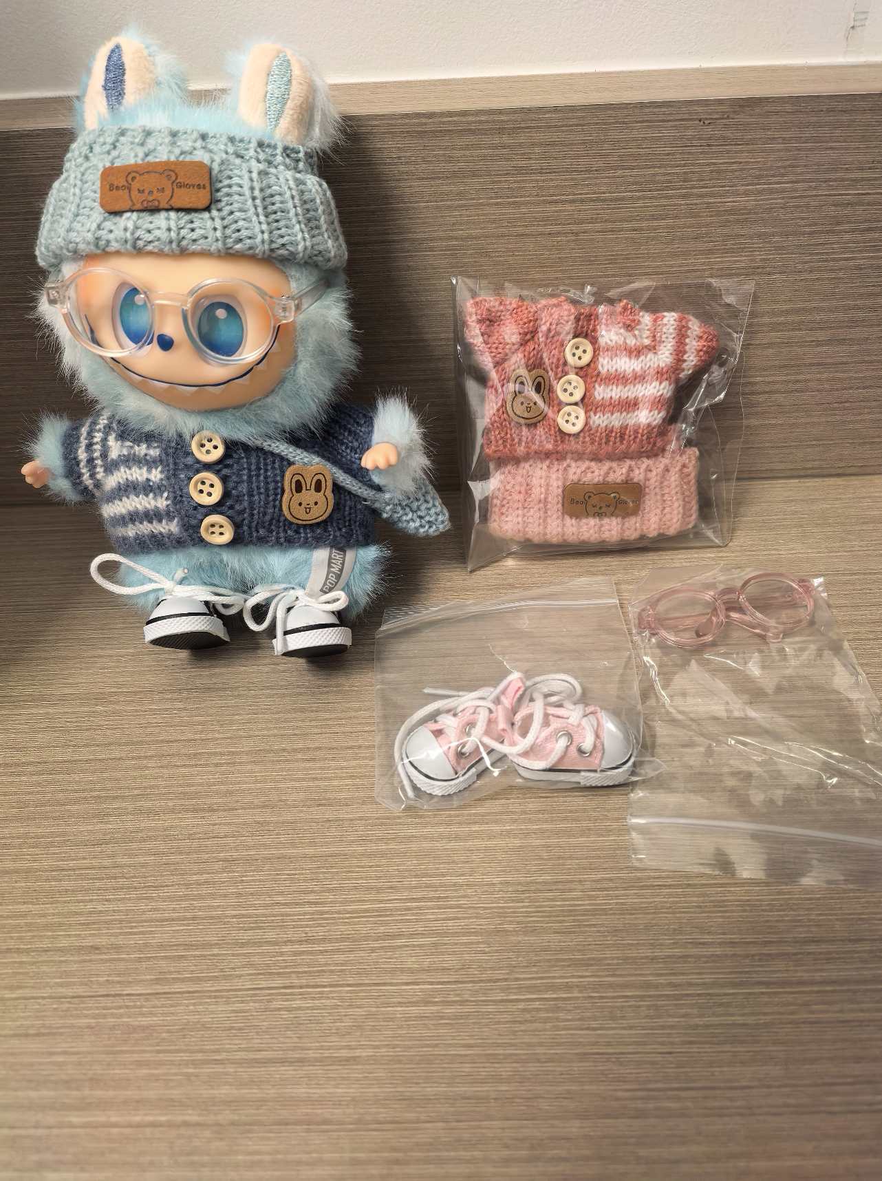 La bubu clothes suites including glass and shoes and headgear. It is pink. Labubu size: 18cm tall.